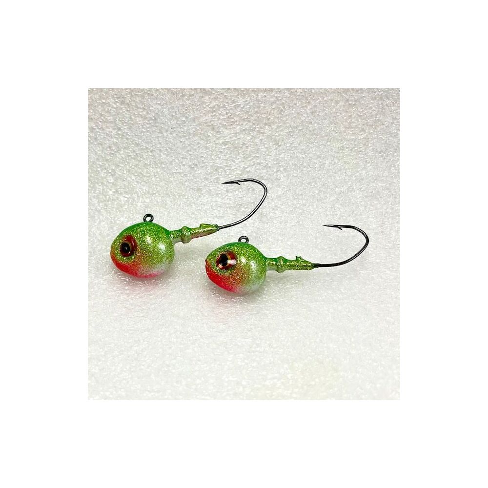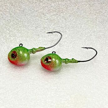 Fish Head Pro Jigs are hand poured and hand painted here in Michigan. All 5 sizes are made using sticky sharp, premium 5/0 Mustad Black Nickel, Needle Point hooks. The paint finishes incorporate ultra durable baked on UV and super glow powder coat paint and have epoxy sealed life like 3-D eyes for incredible realism. The hydrodynamic fish head shape cuts through current for deep water river jigging like the Detroit river and acts like a stabilizing rudder when used for casting swim baits or grubs for small mouth bass or other game fish.