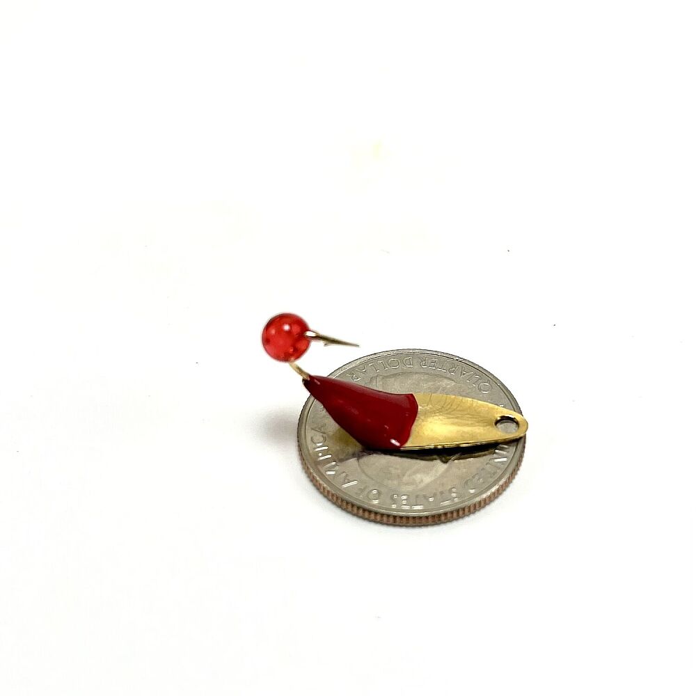 Mark's Tiny Triples are now available in extremely limited quantities in this Gold Plated variant. Tiny Triples are made using a #2 willow leaf blade and are then painted and hand soldered here in Michigan. Bead spoons like these have been around for nearly 5o yrs in the great lakes region and are known for their incredible ability to catch huge numbers of big fat yellow bellied perch and many other species too